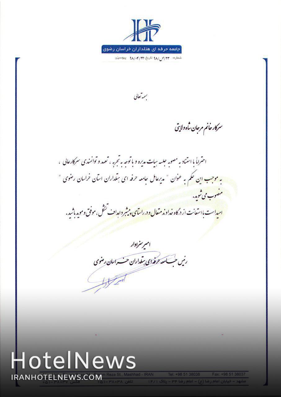 انتصاب سرکار خانم "مرجان شاه ولایتی" به عنوان مدیرعامل جامعه حرفهای هتلداران استان خراسان رضوی