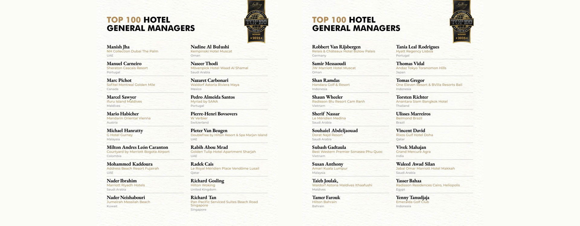 در این گزارش تأکید شده است که این مدیران، چه در هتلهای شاخص شهری و چه در اقامتگاههای لوکس و دورافتاده، با ترکیب تعالی عملیاتی و خدمات صمیمانه، تجربهای ماندگار برای مهمانان بینالمللی خلق کردهاند.