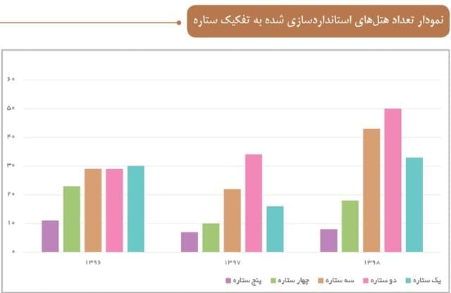 وضعیت کیفیت یا استانداردسازی هتلها به تفکیک در سال ۹۸ نیز اینگونه گزارش شده است: از مجموع ۱۲۷۳ هتل در کشور ۱۵۲ هتل گواهی کیفیت گرفتهاند که حدود ۱۲ درصد هتلها را شامل میشود. سهم هتلهای پنجستاره از این مجموعه ۸ واحد، چهارستاره ۱۸ واحد، سهستاره ۴۳ واحد، دوستاره ۵۰ واحد و یک ستاره ۳۳ واحد بوده است.