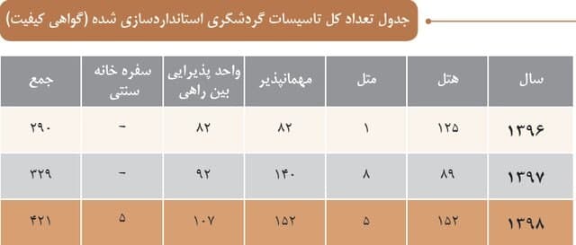 وزارت میراث فرهنگی، گردشگری و صنایع دستی اعلام کرده از مجموع ۶۰۳۲ واحد اقامتی و گردشگری که اطلاعات آنها تا سال ۹۸ ثبت شده، تنها ۴۲۱ واحد استانداردسازی شده و گواهی کیفیت گرفتهاند.